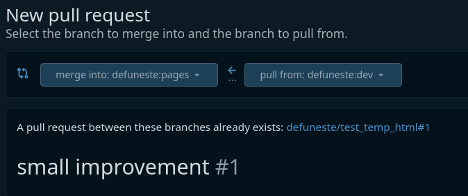 Finally, when you think you are ready you can merge your dev- branch into the pages. You can either decide to merge your dev- to pages on your local repository and push to Codeberg. This is an option here if you are working alone.