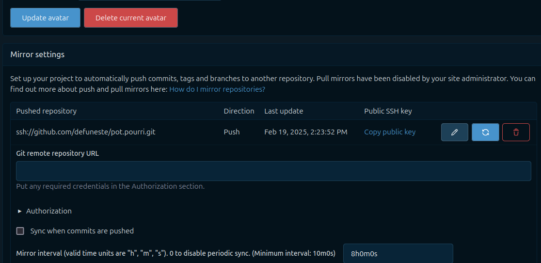 Click Add push mirror, at which point you’ll see a new entry in the mirrors listing.